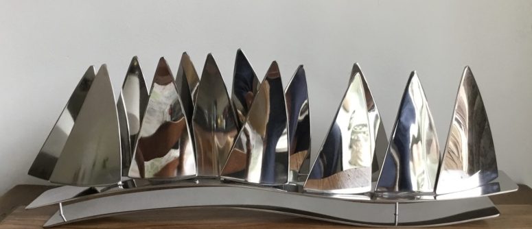 Kinetic sculpture of main sail and head sail in polished stainless steel ( 2,25 mtr high) tacking with wind energy.